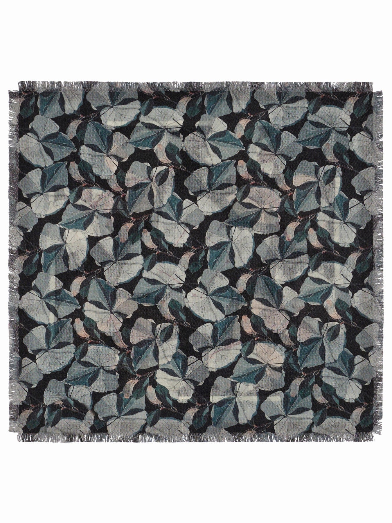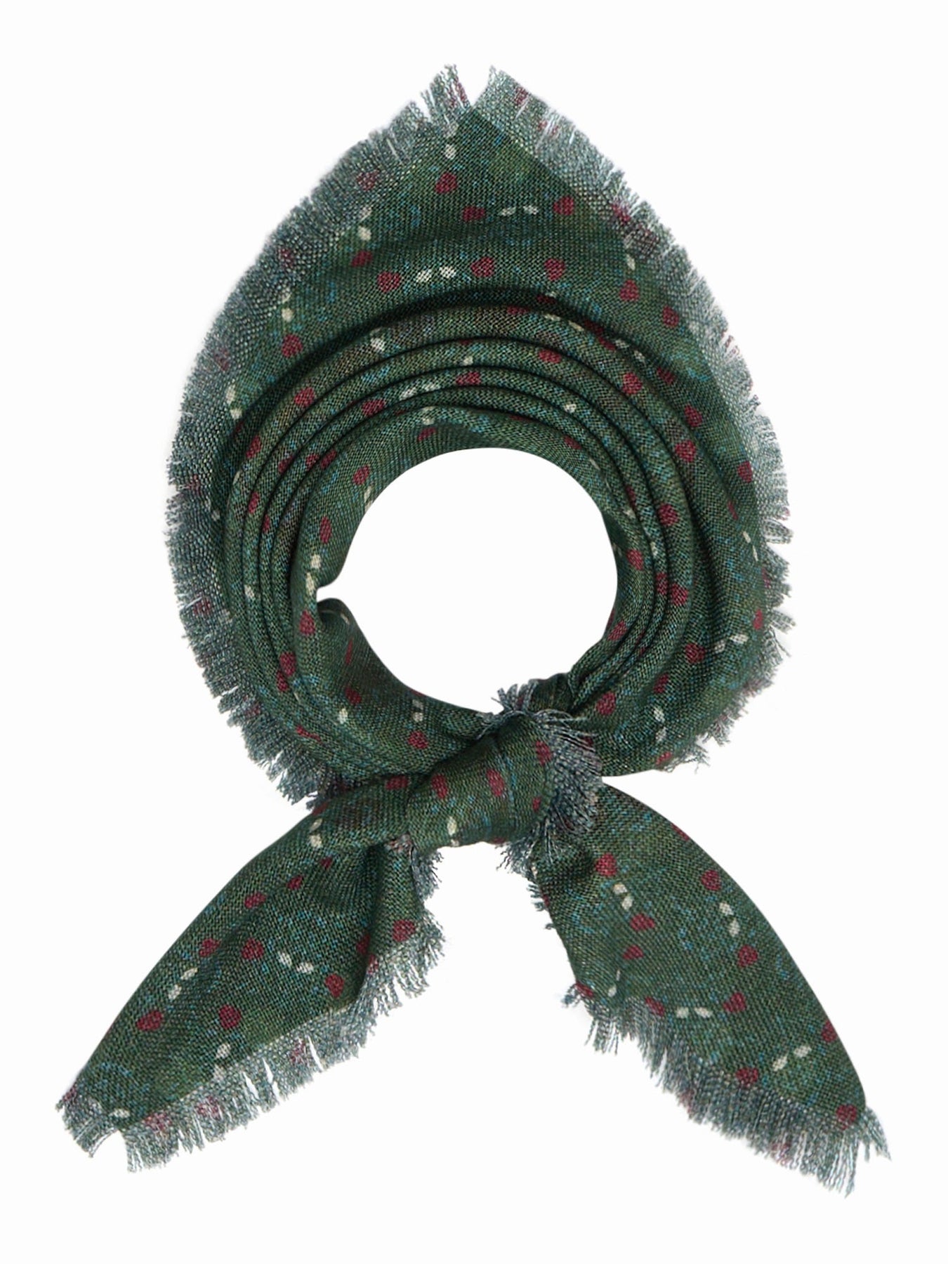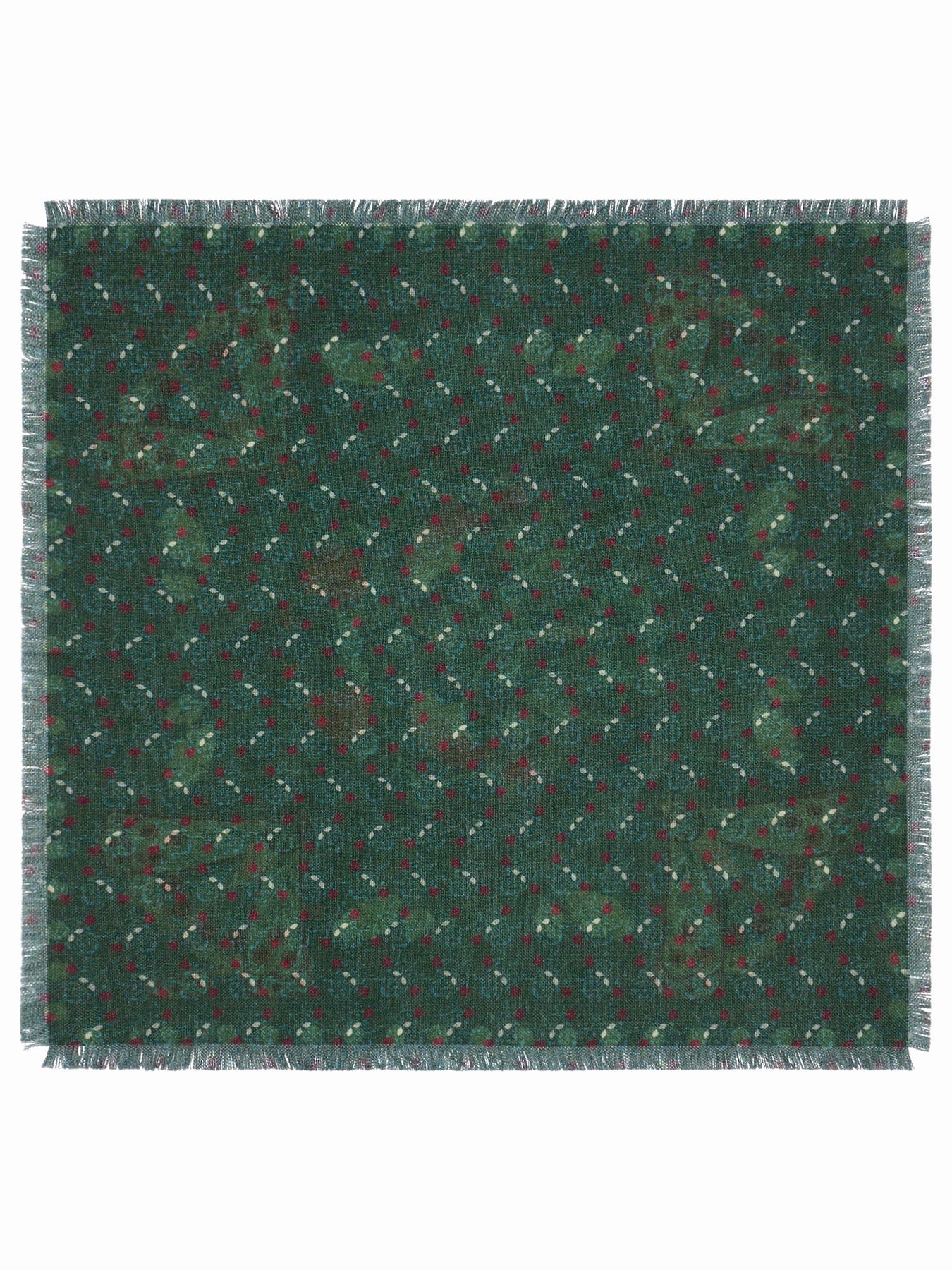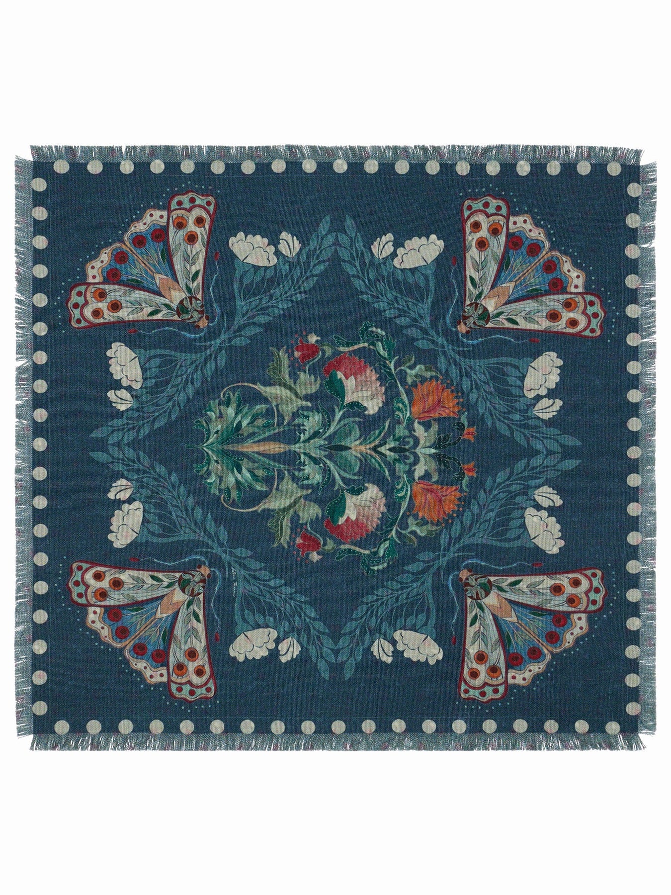 This Franco Ferrari wool scarf exemplifies thoughtful design through its reversible construction and premium craftsmanship. Woven from 100% wool, it provides genuine warmth while maintaining a lightweight, breathable quality ideal for layering across seasons. The primary side features a commanding indigo palette enriched with intricate florals, butterflies, and botanical elements, anchored by a dotted border and softly fringed hem. The reverse showcases a sophisticated green foundation with delicate dotted vine patterns in jewel tones, offering understated refinement. This dual-aspect design grants you complete styling flexibility—transition from bold, eye-catching statements to quietly elegant sophistication with a simple flip, making it an essential piece for those who value both versatility and artistic expression.