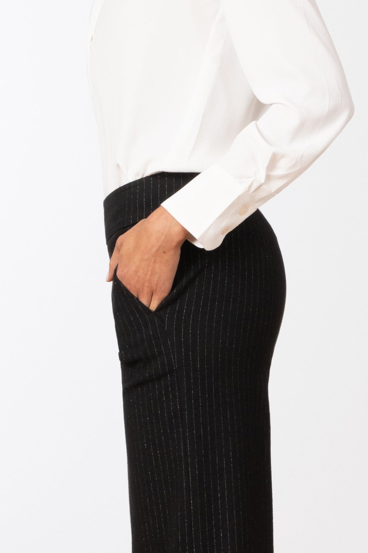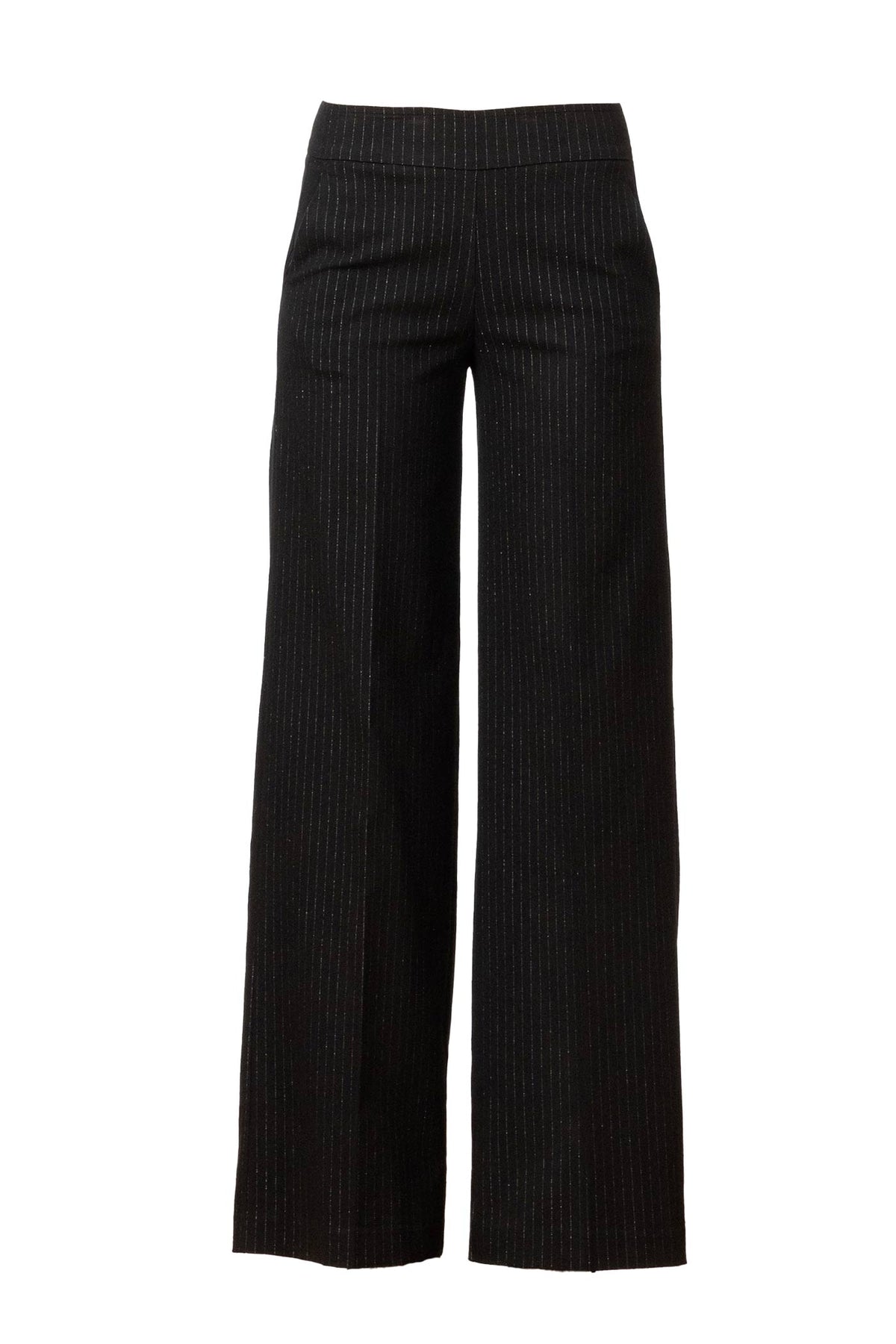 The Carla Pinstripe Glitzine features a full-length palazzo silhouette with pockets, designed for effortless comfort and a graceful, flowing fit. Crafted from our new Boucle stretch fabric, it offers a luxurious glittery texture that balances style with sophistication. The fabric’s stretch ensures ease of movement while maintaining a tailored look. With a 31” inseam and true-to-size fit, these pants combine elegance and practicality. Suitable for hand washing or delicate machine cycles in cold water, they provide a refined option for both day and evening wear.