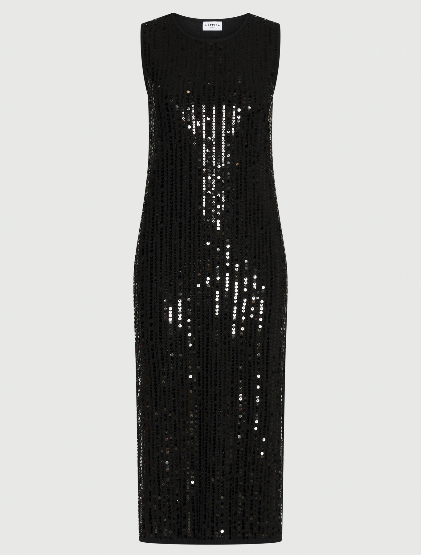 The Adetto Knit Sequin Dress combines elegance with a modern edge through its sleeveless bouclé knit design. Expertly crafted with embroidered sequins, it delivers a subtle, shimmering effect that catches the eye. Contoured darts and tucks shape a tailored, figure-hugging silhouette, ensuring a flattering fit that enhances your natural lines. Ideal for occasions where refined sparkle and sophisticated style are key.