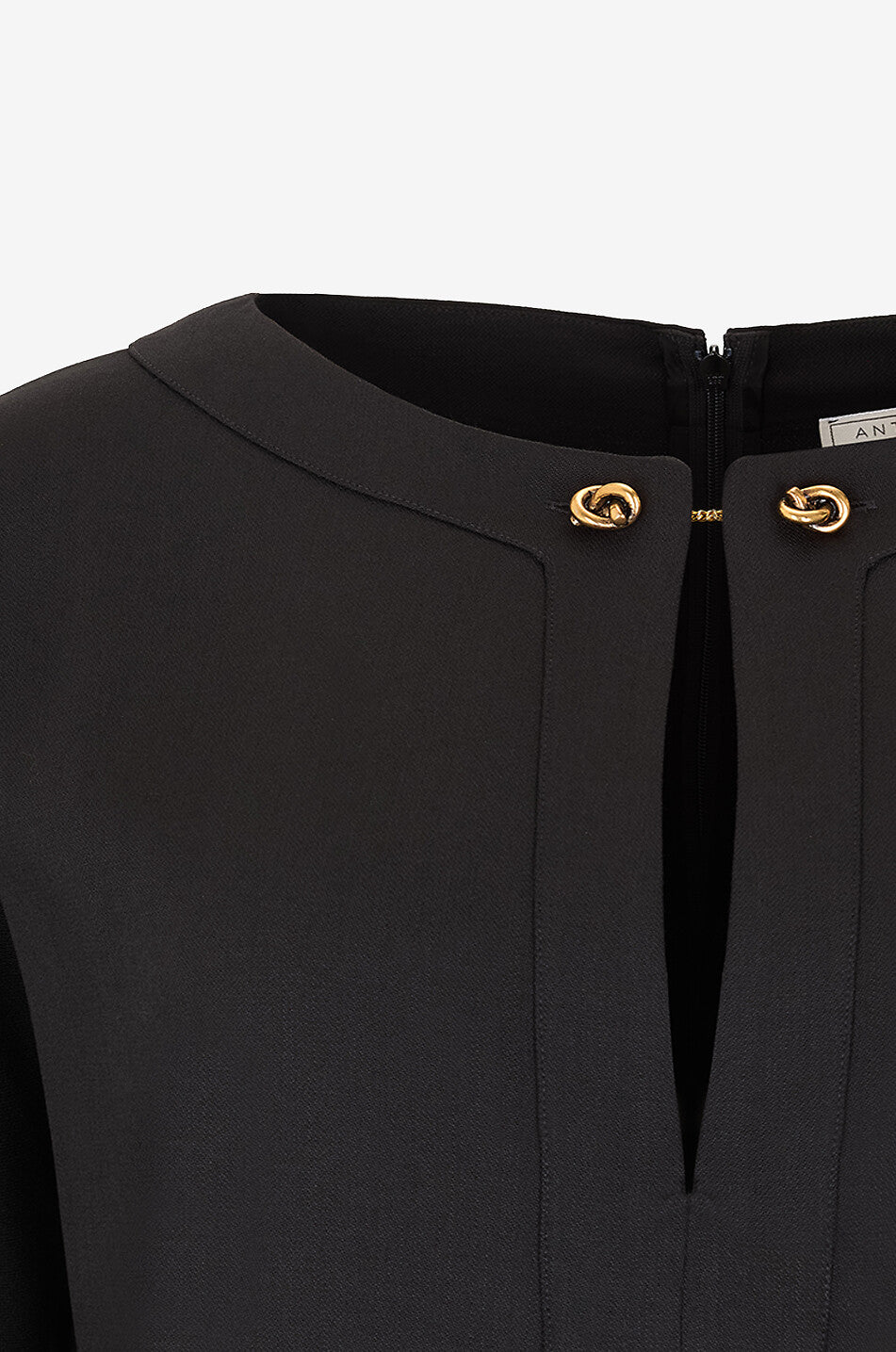 This Malibu Dress by Antonelli Firenze features a gracefully refined V-neckline embellished with subtle golden accents, enhancing your silhouette with elegance. Its batwing sleeves introduce a modern flair, while the fluid cut gently contours the body for a sophisticated fit. Ideal for upscale evening occasions, it pairs effortlessly with heeled sandals and a minimalist clutch to complete a polished look.