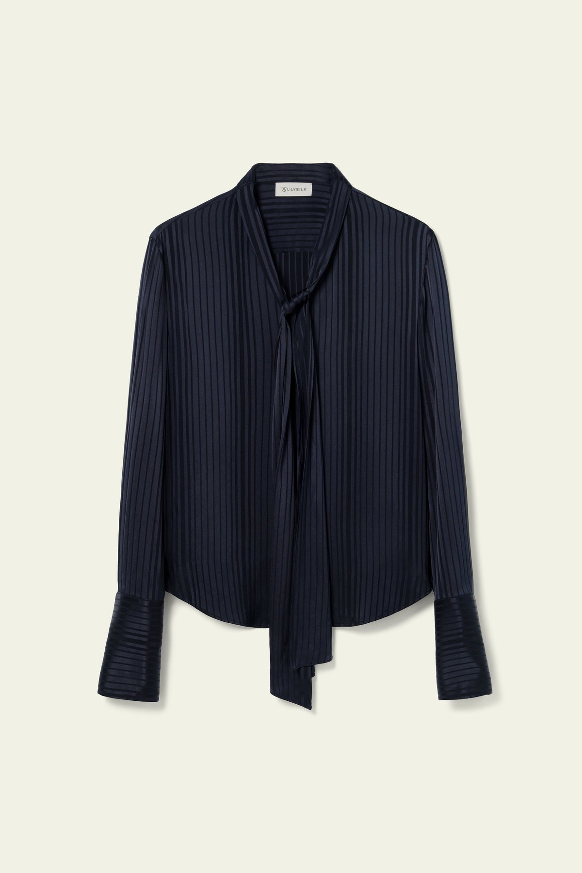 Invest in timeless elegance with this expertly constructed silk blouse, fashioned from premium silk that exhibits a gentle luminescence and refined hand-feel. Structured pleating and a graceful V-neckline establish visual dimension, while the generously proportioned fit ensures unrestricted comfort and movement. Long sleeves finished with a charming tie accent evoke classic sensibilities, and the unstructured hem allows for natural drape and flexibility.