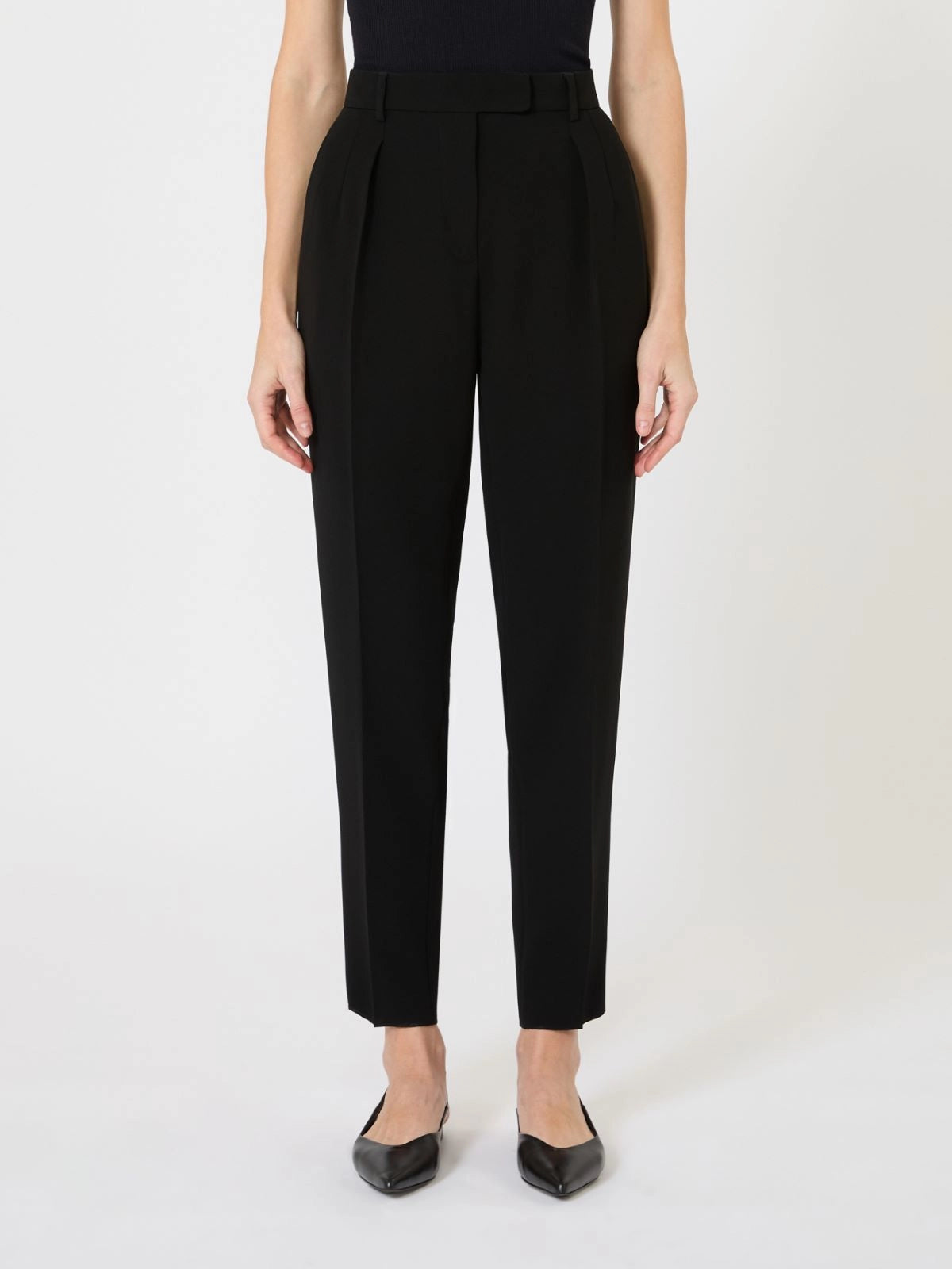 The Cady Carrot Trousers in Black showcase a sophisticated silhouette with generous volume through the thigh and leg that gracefully narrows toward the ankle. This architectural cut delivers contemporary elegance while maintaining wearability—the structured carrot shape creates visual interest and dimension, while the tapered hem grounds the proportions for a polished, intentional look. An investment piece that elevates any wardrobe with its distinctive tailoring and timeless black colorway.