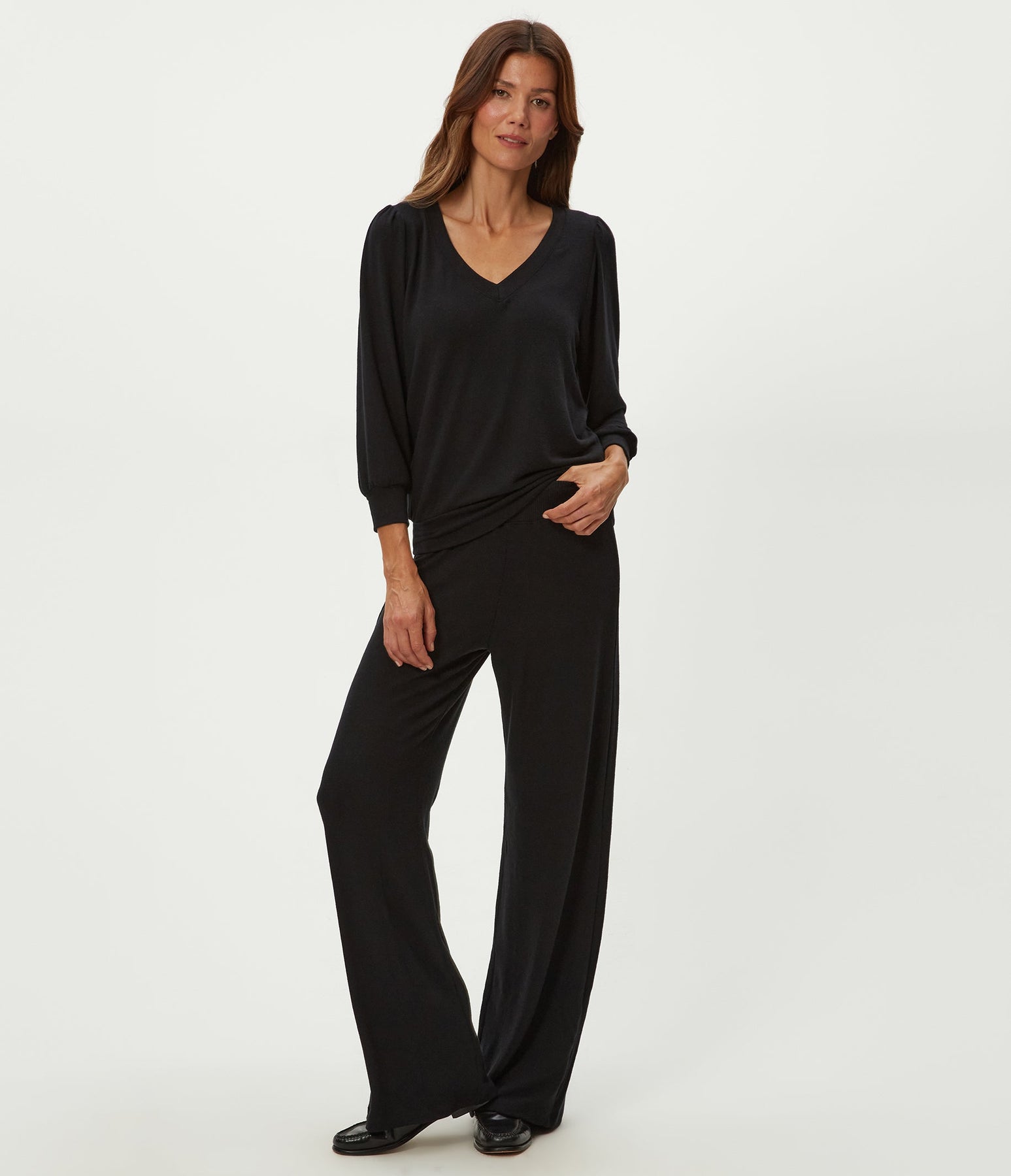 The Jones Wide Leg Pant redefines casual comfort with its thoughtfully designed silhouette. Featuring an elastic waistband that moves with you, this elevated sweatpant pairs effortless wearability with refined style. Crafted from our signature Madison Brushed Jersey—a fabric chosen for its soft, cozy feel—the Jones transitions seamlessly from relaxation at home to quick errands around town. The wide leg cut offers a contemporary take on the classic sweatpant, delivering both comfort and polish in a single piece.