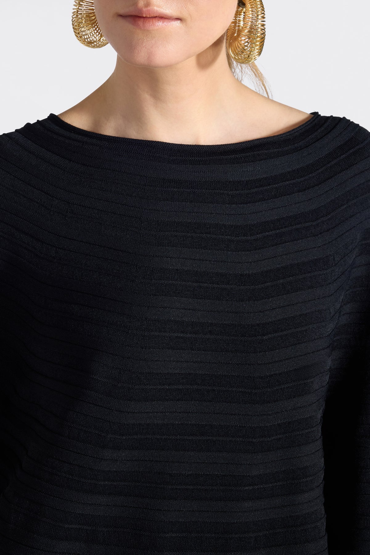 A horizontal ribbed stretch-viscose mini dress with a boat neckline, wide fluted sleeves, and a subtly A-line silhouette.