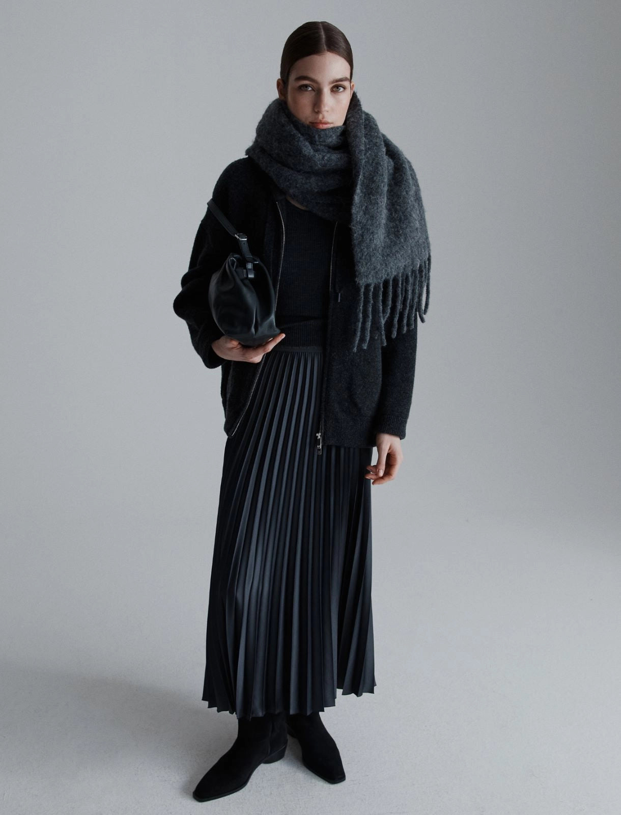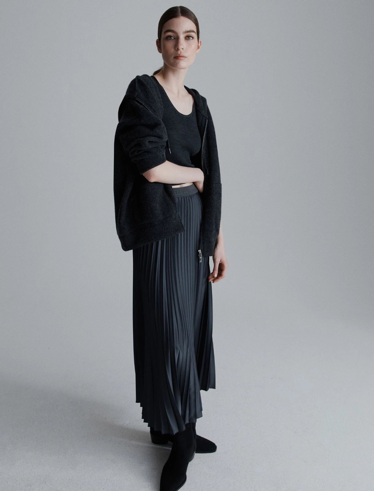 The Pontiac Pleated Skirt features an elegant plissé-pleated design that embodies refined femininity, perfect for the winter season. Its flowing texture pairs effortlessly with cozy sweaters and boots, creating a polished and graceful look every time. This skirt combines timeless style with seasonal versatility, making it a staple for sophisticated cold-weather dressing.