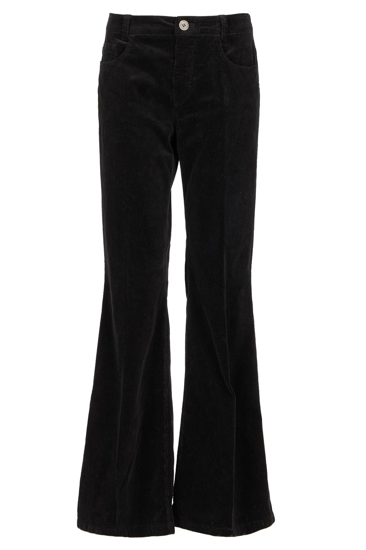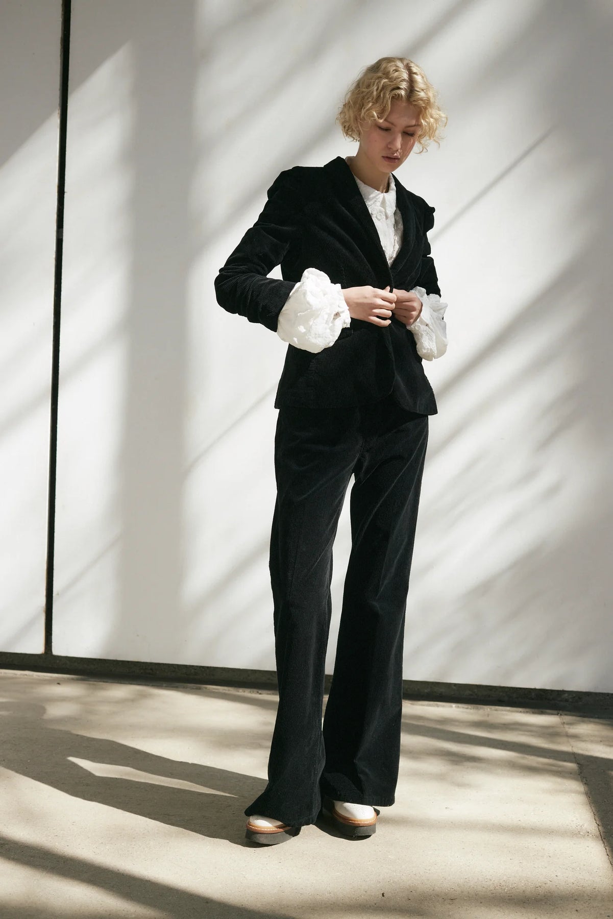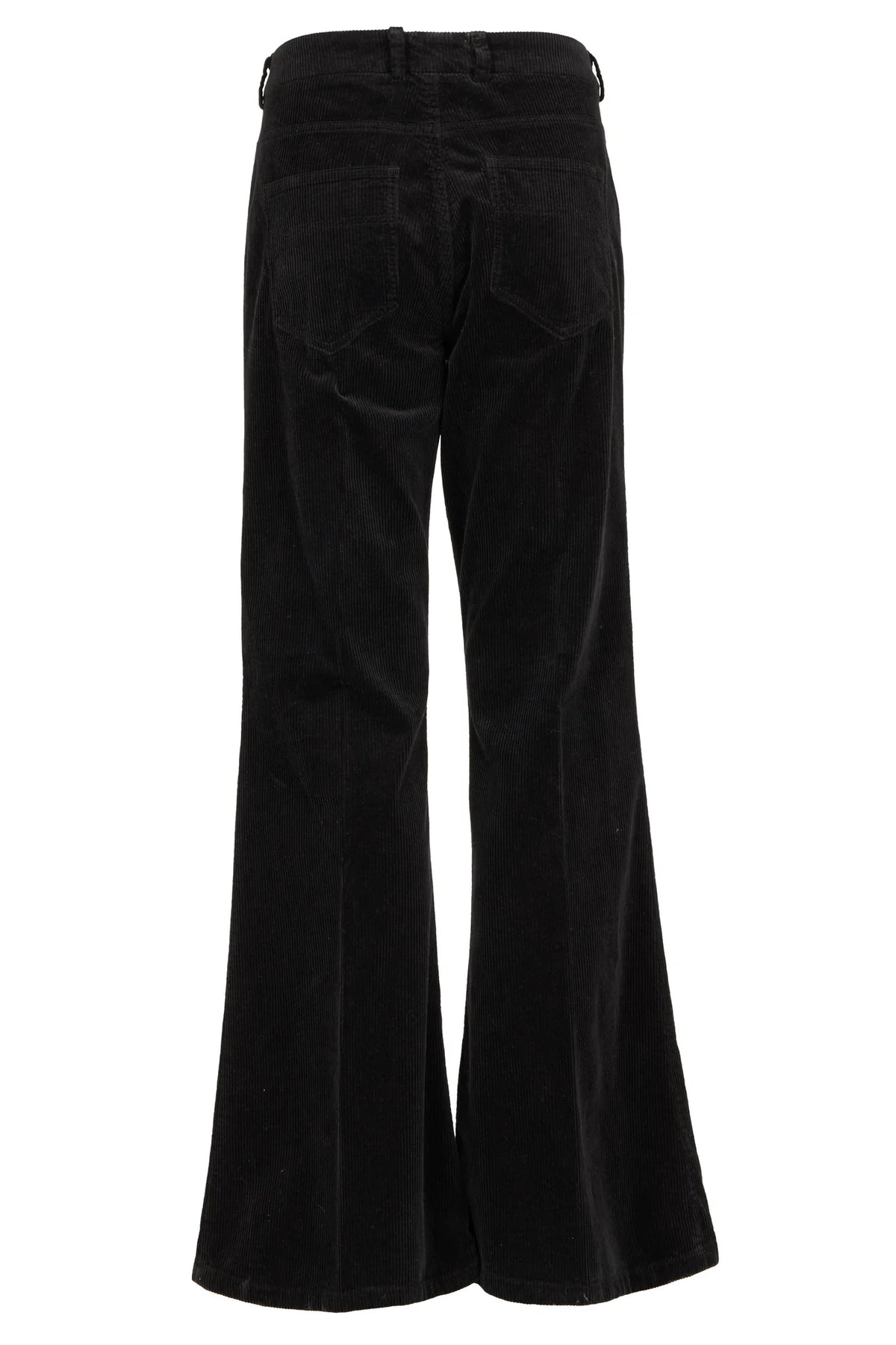 Floor-length women’s trousers—soft corduroy with a subtle sheen, flared leg, true-to-size fit, cotton-lyocell blend, practical pockets, and belt loops for versatile style.