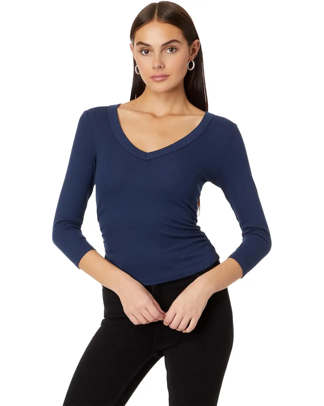 The Enid 3/4 Sleeve V-Neck Crop Tee from Michael Stars™ delivers effortless versatility for your everyday wardrobe. Crafted from luxuriously soft ultra rib fabric, this pull-on style offers a flattering V-neckline and three-quarter length sleeves that work across seasons. The cropped silhouette with a clean straight hemline pairs seamlessly with high-waisted bottoms or layered pieces, making it an indispensable foundation for casual dressing. Slip it on for instant polish without compromise.
