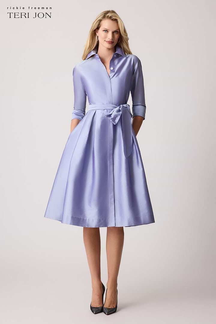 This taffeta shirt dress offers a perfect blend of classic and modern style, ideal for your next formal event. Featuring elbow-length sleeves, a tea-length hem, and a detachable sash belt, it balances elegance with a flattering silhouette. The pleated skirt detail introduces dynamic movement and sophistication. Complete the look with a neutral heel for refined appeal.