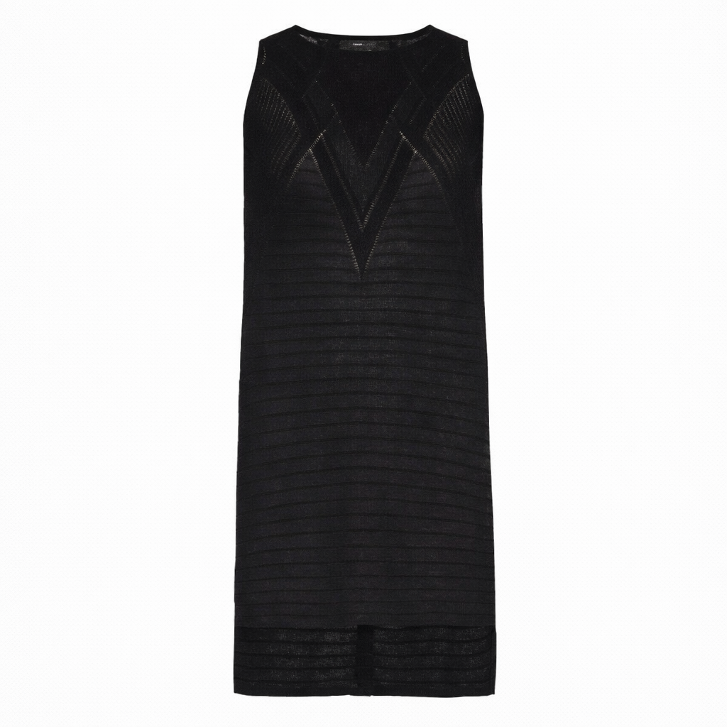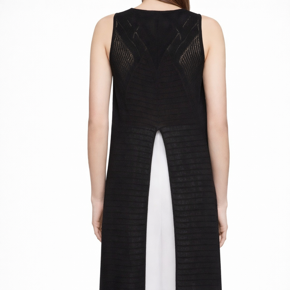 The Jocelyn Top showcases refined elegance through its sleeveless cotton knit construction, featuring sophisticated Art Deco-inspired pointelle detailing that adds visual depth and texture. The high-low hemline creates dynamic movement, while strategic slits at both sides and back provide contemporary flair and ease of wear. Crafted from soft, breathable cotton, this piece delivers comfort without compromising on style. In excellent condition with no visible flaws, it's a versatile layering essential that transitions seamlessly from day to evening wear.