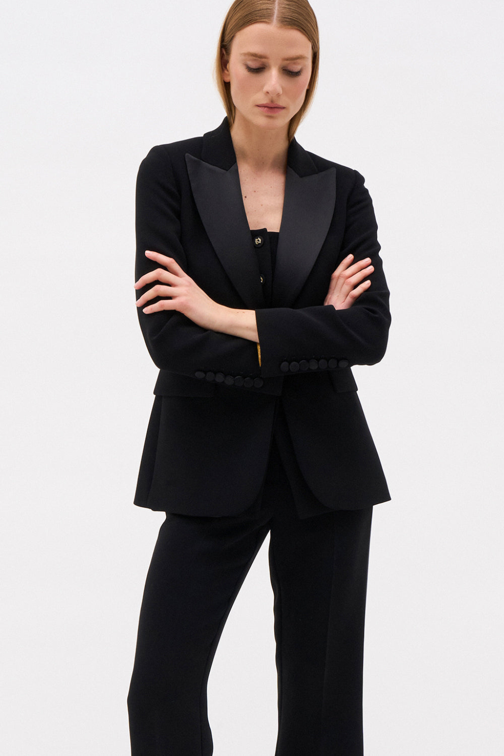 The Mila Tuxedo Jacket offers a refined silhouette with tailored precision, perfect for elevating formal attire. Crafted from premium fabric, it delivers both structure and comfort. Its classic lapel design and streamlined fit create a sophisticated look suitable for professional events or elegant evenings, ensuring you stand out with understated elegance.