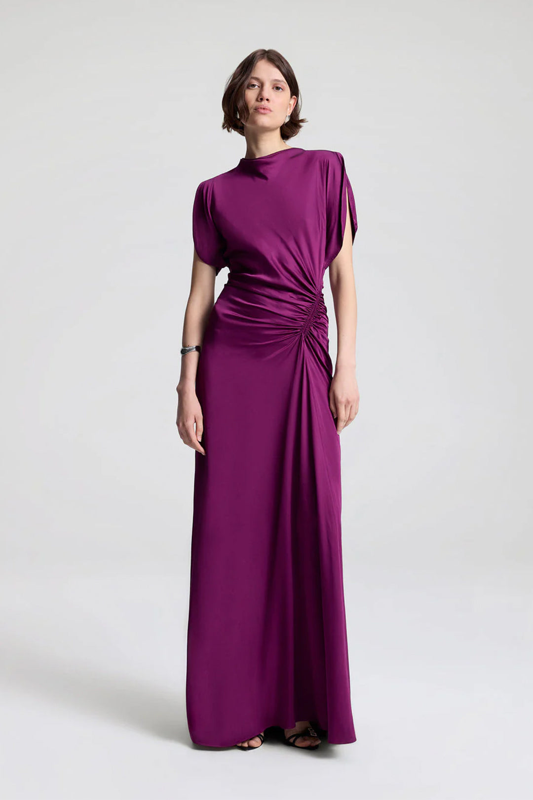 The Nadia Satin Gown by A.L.C. showcases a fluid satin design with a draped cowl neckline that enhances elegance. Its slit sleeves and softly gathered hip detail create a graceful silhouette that moves effortlessly. Perfect for formal occasions, this gown combines refined tailoring with a modern sense of ease.