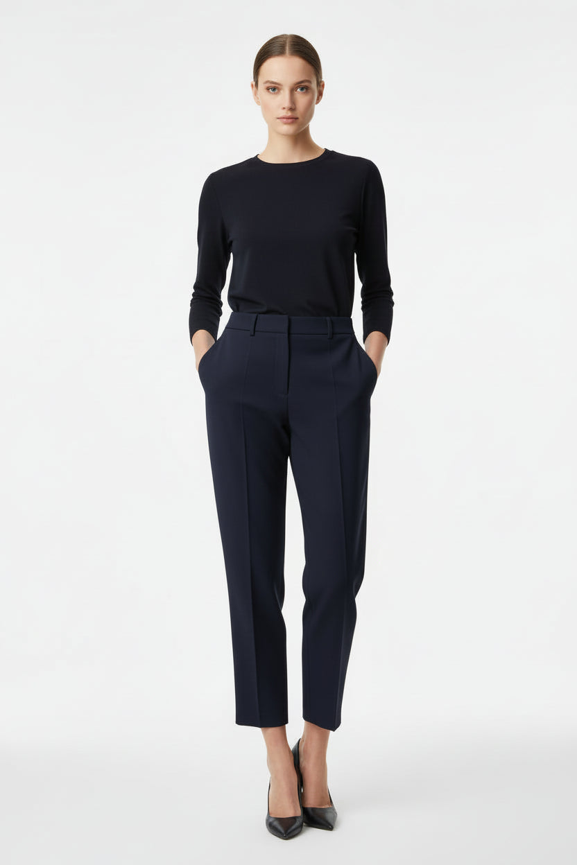 This slim pant exemplifies modern tailoring with its streamlined cut and sophisticated blue hue. The fitted silhouette flatters while maintaining ease of movement, making it ideal for both professional and casual settings. Constructed with attention to detail, it pairs seamlessly with blazers, sweaters, or minimalist tops for versatile styling options throughout your wardrobe.
