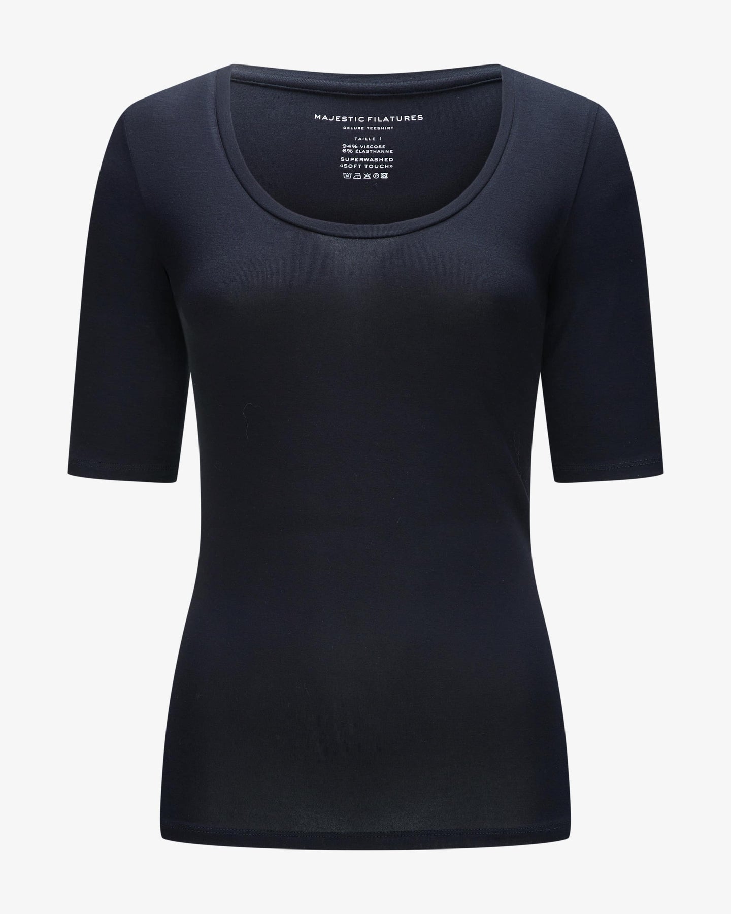 Discover the perfect basic for women with Majestic Filatures' Soft Touch Elbow Sleeve Scoop Neck. The night blue T-shirt features a simple yet comfortable design, made from an elastic material mix that guarantees high wearing comfort.