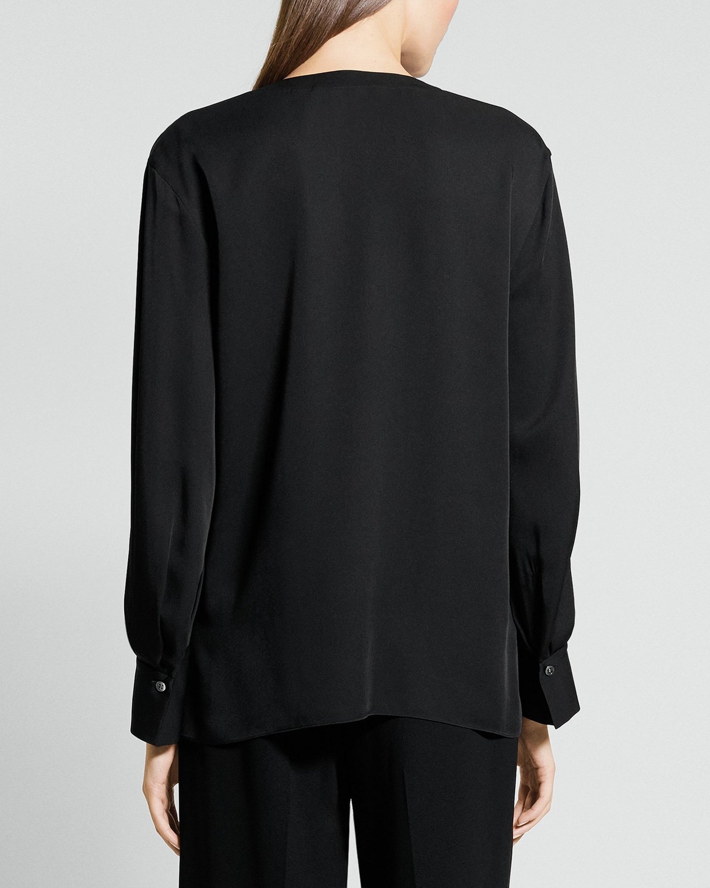 Defined by a sharp V-neckline, this blouse offers a relaxed fit with dropped shoulders and long, voluminous sleeves finished with button cuffs. Hidden button-front closures provide a streamlined look. Crafted from airy silk georgette certified by OEKO-TEX® MADE IN GREEN, it's produced without harmful chemicals in environmentally and socially responsible facilities. Weightless and effortless.