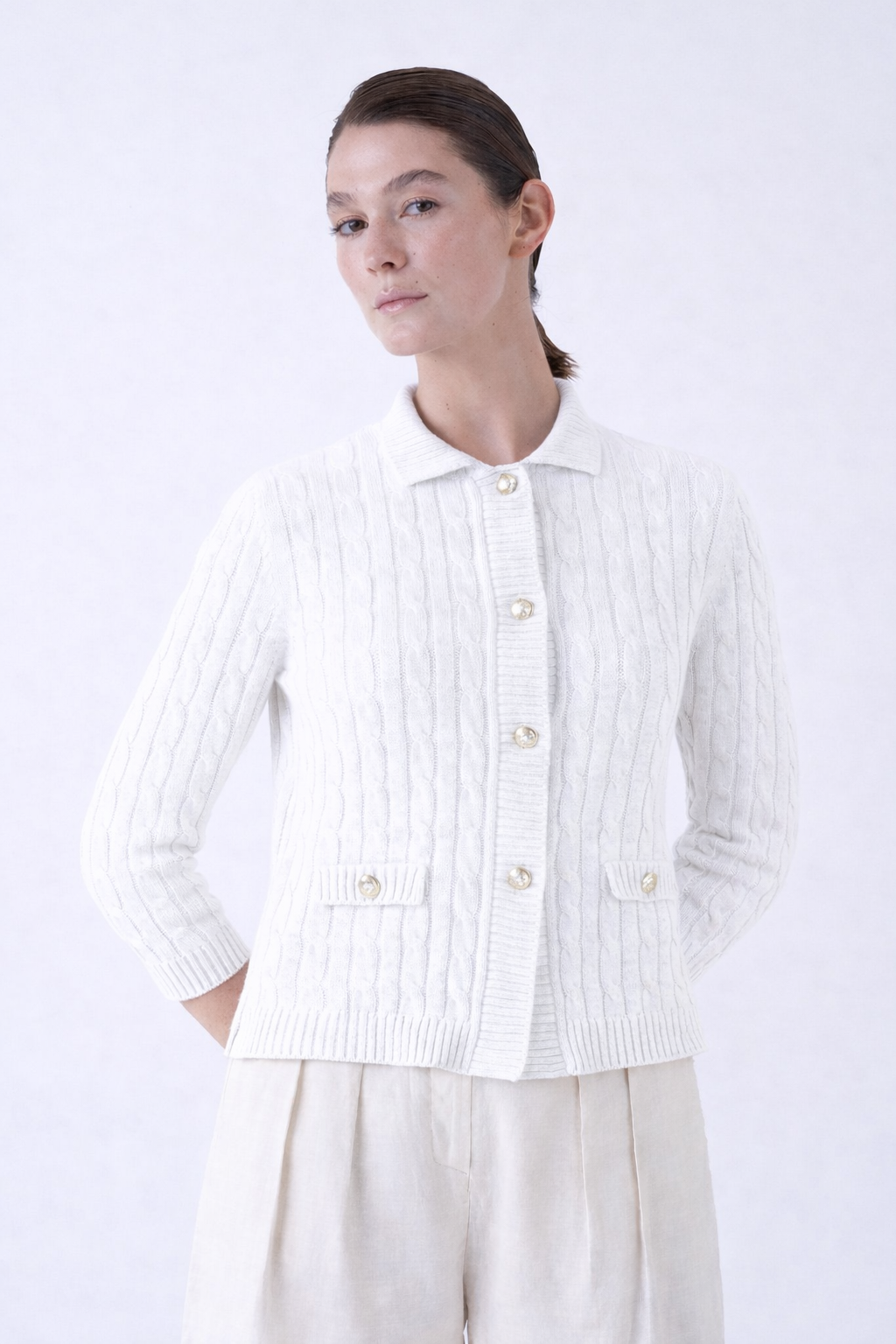 The Vassilly Serie 01 represents thoughtful knitwear design through its organic cotton construction and intricate cable knit pattern. This cardigan combines technical craftsmanship with sustainable material sourcing, offering a garment built to last. The natural fiber regulates temperature effectively across seasons, while the classic knit texture adds sophisticated dimension to layered styling.